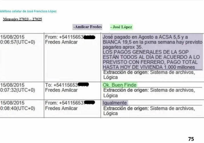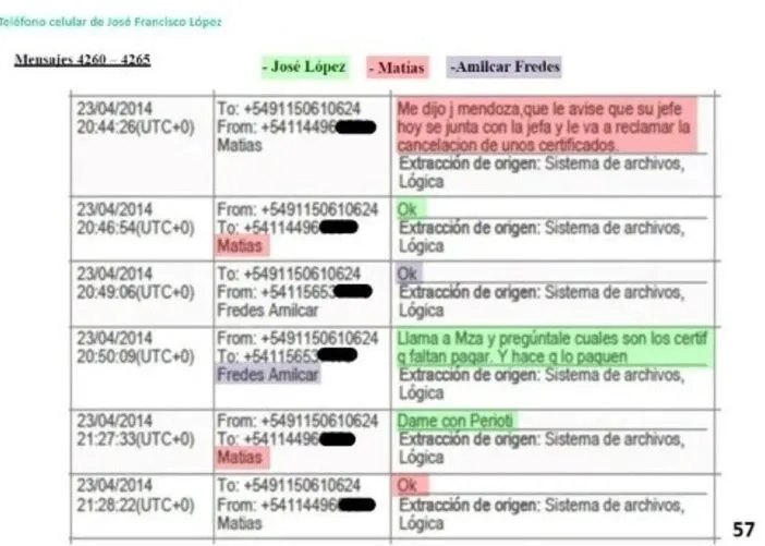 "Hola Germán (Nivello) ¿Cómo anduvieron los pagos esta semana? Tengo una llamada perdida de Mdza (por Julio Mendoza, presidente de Austral Construcciones) ¿Pasó algo? Llamalo y preguntale", escribió José López. El fiscal Luciani agregó: "Basta una llamada del presidente de Austral para que el secretario de Obras Públicas se preocupe y mande a averiguar qué necesita la empresa".