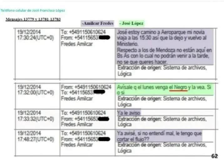 Eso ocurrió el 18 de noviembre de 2015, a menos de un mes de que Cristina dejase la Casa Rosada. Pocos minutos antes, José López le había escrito a Germán Nivello -que en aquel entonces era el segundo en la secretaría de Obras Públicas- "dicen (por Austral Construcciones) que los pagos están en la nebulosa".
