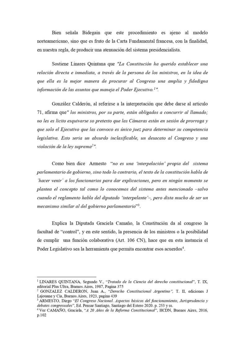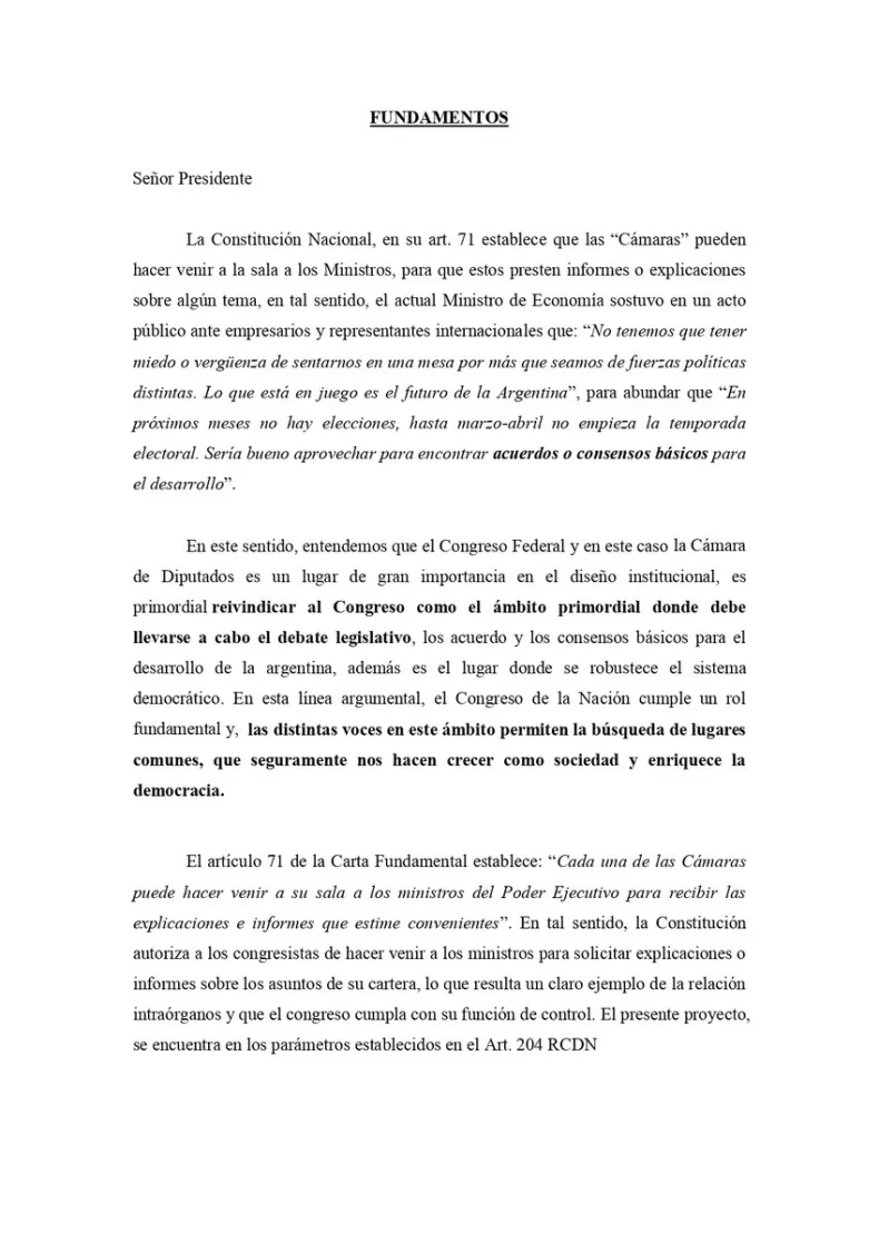 Entre los fundamentos expresados explica que la Constitución Nacional, en su artículo 71 establece que "las Cámaras pueden hacer venir a la sala a los Ministros, para que estos presten informes o explicaciones sobre algún tema".