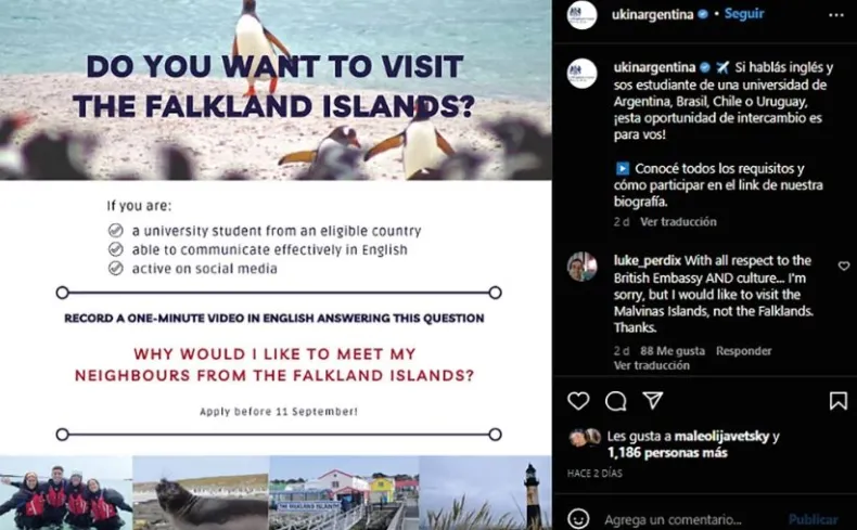 La iniciativa, que fue difundida en las redes sociales de la Embajada, invita a estudiantes universitarios de Argentina, Brasil, Chile y Uruguay para que conozcan cómo viven sus "vecinos de las islas Falkland".