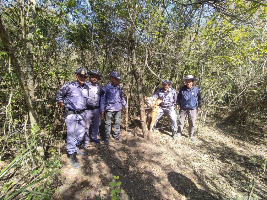 A partir de eso se inició el seguimiento de rastro por una distancia de unos 5 kilómetros donde en una zona boscosa hallaron tambeado un ternero con su hocico amarrado encontró en el lote 39, Colonia Aborigen.