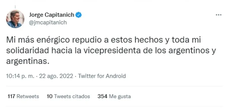 Y finalizó escribiendo: "Mi más enérgico repudio a estos hechos y toda mi solidaridad hacia la vicepresidenta de los argentinos y argentinas".