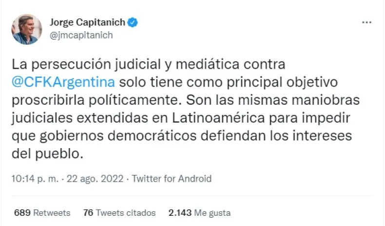 Después de las 22 horas, en su cuenta oficial de Twitter expresó: "La persecución judicial y mediática contra Cristina Kirchner solo tiene como principal objetivo proscribirla políticamente. Son las mismas maniobras judiciales extendidas en Latinoamérica para impedir que gobiernos democráticos defiendan los intereses del pueblo".