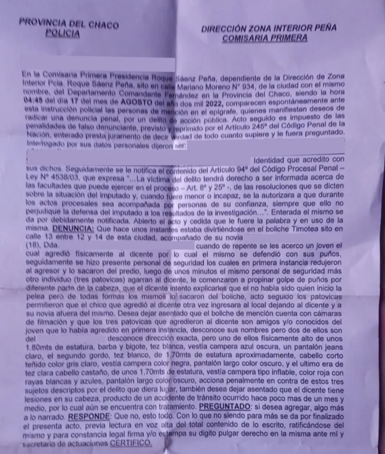 Si bien el denunciante no pudo acreditar los nombres de quienes lo habrían agredido, afirmó en su declaración que los 3 patovicas son amigos de quien habría iniciado la pelea. Según el informe medico el denunciante no había consumido ni alcohol, ni drogas.