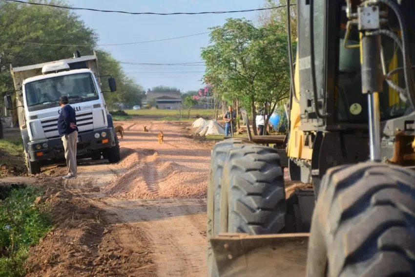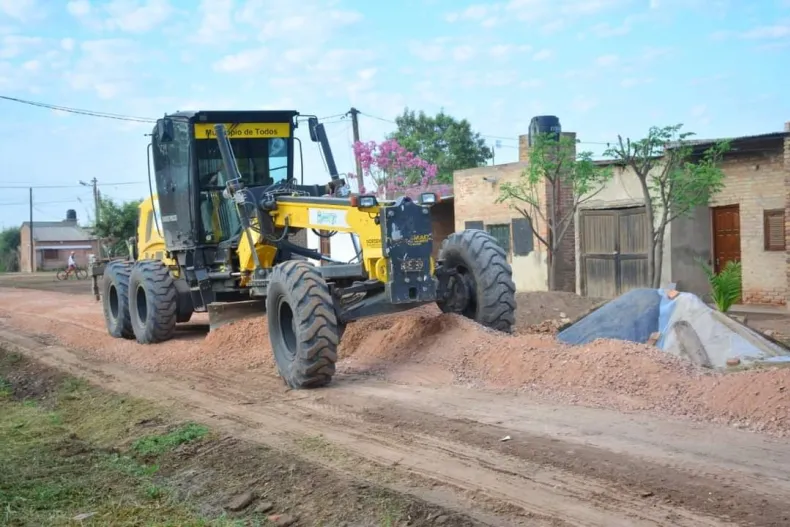 Un importante operativo integral se lleva adelante en Quinta 12, sobre calle 2 de Febrero. Personal del municipio, en un trabajo coordinado, realiza el relleno, compactación y enripiado de esa importante arteria.