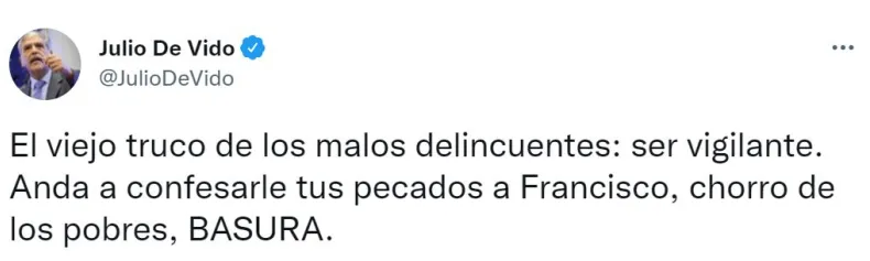Estas declaraciones incentivaron una dura respuesta de Julio De Vido, ex ministro de Obras Públicas, quien acusó en sus redes sociales: "El viejo truco de los malos delincuentes: ser vigilante. Anda a confesarle tus pecados a Francisco, chorro de los pobres, BASURA".