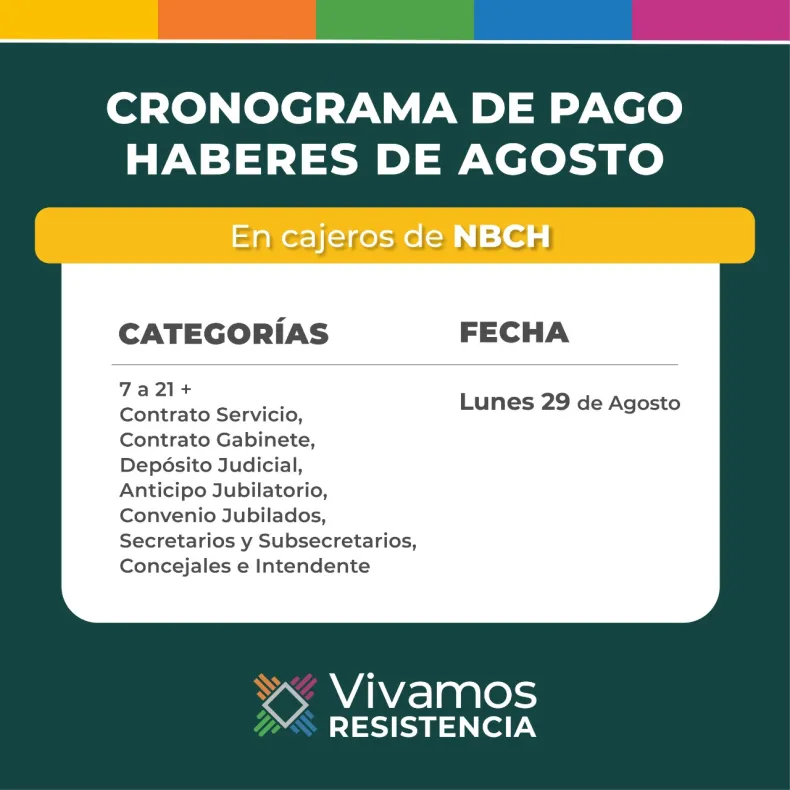El Municipio de Resistencia informa que este lunes 29 de agosto de 2022, estarán depositados en los cajeros del Nuevo Banco del Chaco, los sueldos de agosto para todos los trabajadores municipales.