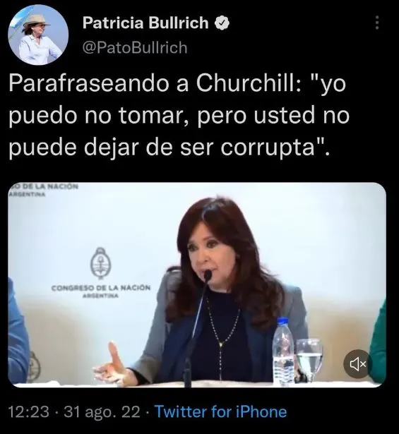 "Parafraseando a Churchill: ‘Yo puedo no tomar, pero usted no puede dejar de ser corrupta’", fue el texto completo que la exministra de Seguridad de Mauricio Macri incluyó en la publicación, que borró apenas minutos después.