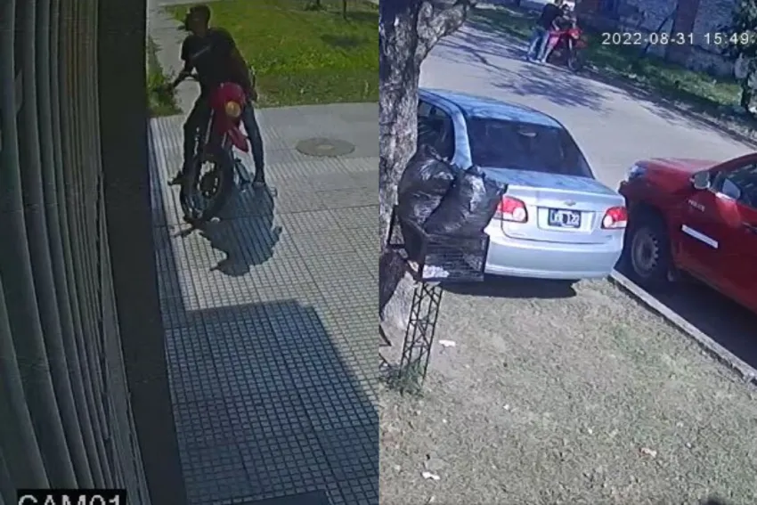 En las grabaciones de las cámaras de seguridad aportadas por la vecina, se puede ver el momento en el que el hombre, a bordo de una moto, se sube a la vereda y extrae lo que parece ser un arma