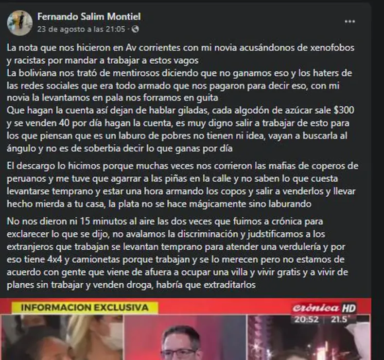 Además, dejó constancia en sus redes de sus llamativas apariciones en Crónica TV en el último tiempo. En uno de los móviles en los que participó, Montiel hizo fuertes críticas a los planes sociales y cuestionó a la clase política. También planteó la extradición de los extranjeros.