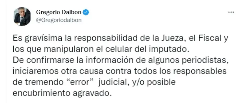 Gregorio Dalbón dijo que si se formateó el celular del agresor "todos los que lo tocaron tendrán sus consecuencias"
