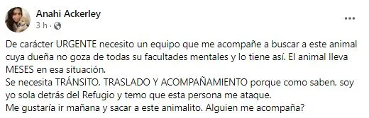 Anahí Ackerley es la fundadora de Somos Su Voz y está buscando personas que la ayuden a retirar al perro enjaulado, conseguirle un lugar de tránsito y llevarlo al veterinario.