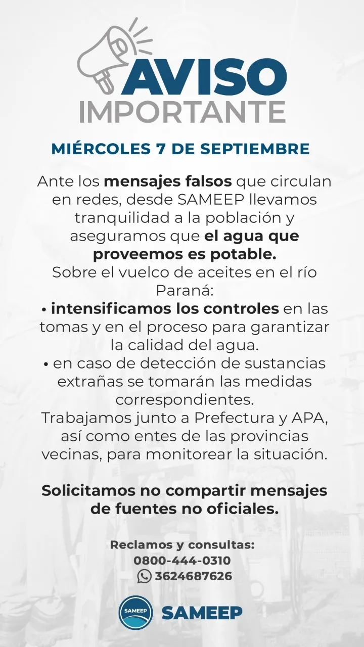 Después del derrame de hidrocarburos que aconteció ayer en el Rio Paraná y ante la proliferación de mensajes en redes sociales que promueven desinformaciones, SAMEEP afirmó que el agua que provista es potable.