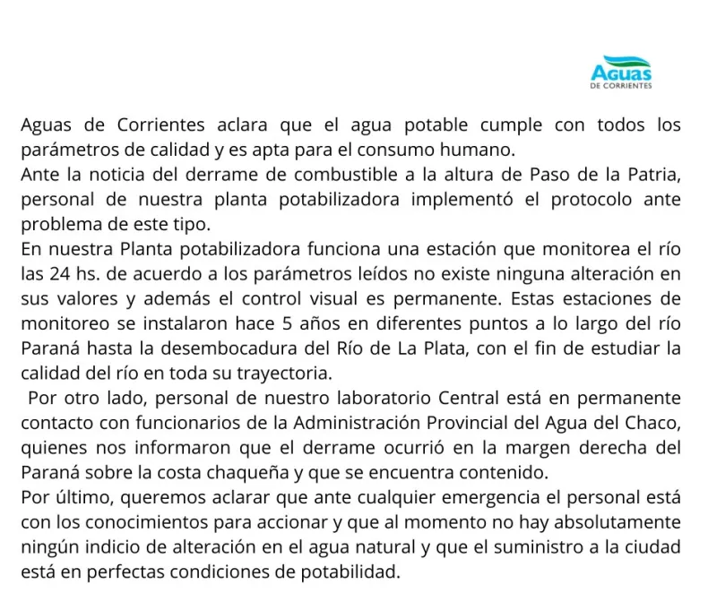 Por otro lado, personal del laboratorio central de la empresa "está en permanente contacto con funcionarios de la Administración Provincial del Agua del Chaco, quienes nos informaron que el derrame ocurrió en la margen derecha del Paraná sobre la costa chaqueña y que se encuentra contenido".