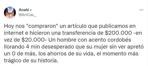 En el caso particular de Anahí Castro (@AniCas_(, el hombre transfirió $ 200.000 en vez de $20.000. "Un hombre con acento cordobés llorando 4 min desesperado que su mujer sin ver apretó un 0 de más, los ahorros de su vida, el momento más trágico de su historia", aseguró.