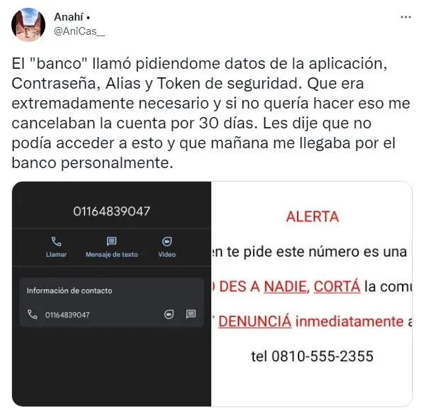 Es posible también que otro número se comunique con quien este siendo la victima de la estafa haciéndose pasar por un "banco". En este caso, le pidieron a la chica la contraseña, alias y token de seguridad de la aplicación había que enviar el dinero. "Si no quería hacer eso -pasar la información- me cancelaban la cuenta por 30 días. Les dije que no podía acceder a esto y que mañana me llegaba por el banco personalmente", aseveró.