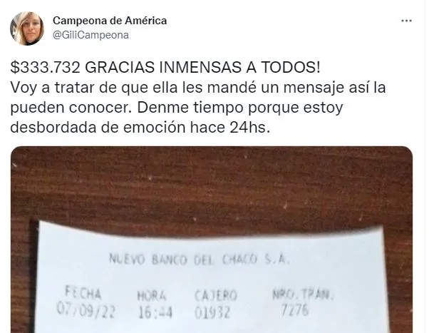 "$333.732 GRACIAS INMENSAS A TODOS! Voy a tratar de que ella les mandé un mensaje así la pueden conocer. Denme tiempo porque estoy desbordada de emoción hace 24hs", concluyó la serie de tweets.