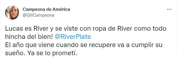"Es hincha de River, vive en Chaco Villa Ángela, se accidentó jugando al fútbol a los 13 años y estuvo en estado vegetativo 2 meses, cuando despertó no podía caminar, fue operado, pero no logró recuperar sus piernas", comentó acompañando el tweet con dos fotos.