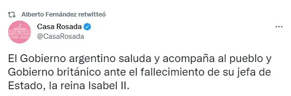 En ese sentido, Casa Rosada también emitió un comunicado a través de Twitter: "El Gobierno argentino saluda y acompaña al pueblo y Gobierno británico ante el fallecimiento de su jefa de Estado, la reina Isabel II".