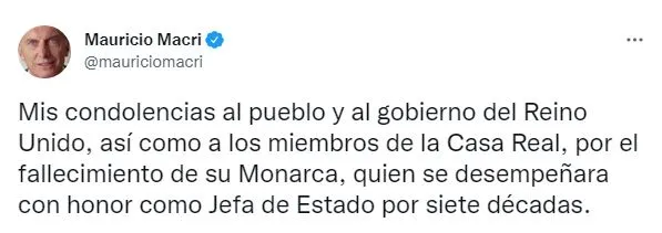 Dentro de los que se expresaron, el expresidente Mauricio Macri fue uno de los primeros: "Mis condolencias al pueblo y al gobierno del Reino Unido, así como a los miembros de la Casa Real, por el fallecimiento de su Monarca, quien se desempeñara con honor como Jefa de Estado por siete décadas", escribió.