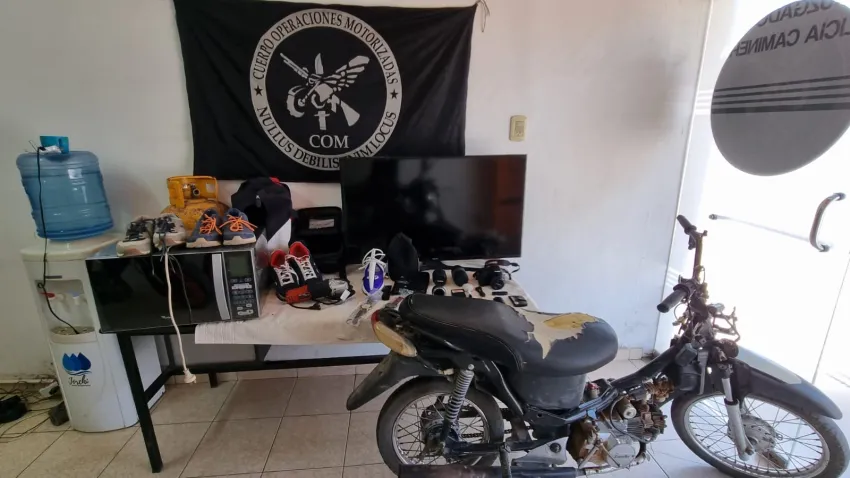 En el lugar los efectivos secuestraron una motocicleta marca y modelo no visible, 110cc., sin carenado, Motor marca Zanella con motor y cuadro limado y diversos elementos sustraídos de la vivienda como un televisor Led, color negro, marca Samsung, 40", un microondas, un tubo de gas de 10Kg, una amoladora, una plancha marca Philips, zapatillas, relojes de marca para hombre, una cámara fotográfica profesional marca Canon, dos teleobjetivo zoom marca canon; un teleobjetivo zoom marca Pentax, dos lentes; porta memoria color negro, entre otros elementos sustraídos de la mencionada vivienda.