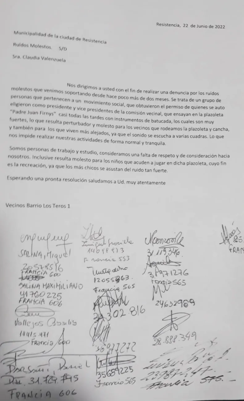 Según la nota presentada por los vecinos en junio, "un grupo de personas que pertenecen a un movimiento social, que obtuvieron el permiso de quienes se autoeligieron presidente y vicepresidente de la comisión vecinal, que ensayan en la plazoleta "Padre Juan Firnys" casi todas las tardes con instrumentos de batucada, los cuales son muy fuertes".