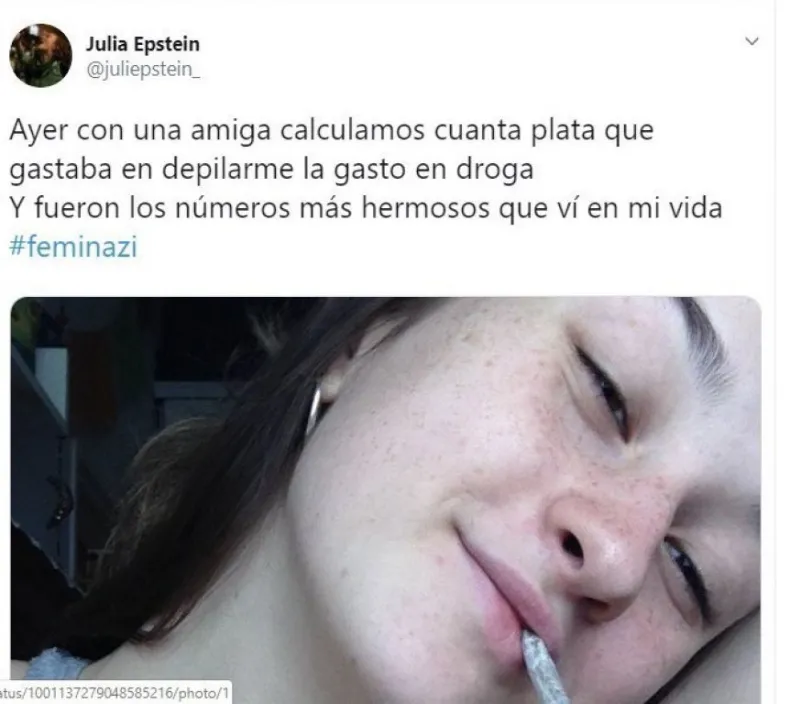 "Ayer con una amiga calculamos cuánta plata que gastaba en depilarme la gasto en droga. Y fueron los números más hermosos que vi en mi vida #Feminazi", se lee en uno de sus tweets.