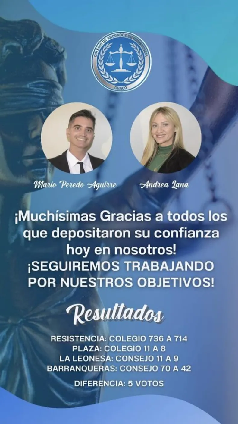 Por su parte, tras conocerse los resultados finales, Peredo Aguirre se expresó en sus redes sociales: "Gracias a todos los que acompañaron las propuestas del Colegio de Abogados y Procuradores de Resistencia, hemos hecho una gran elección".