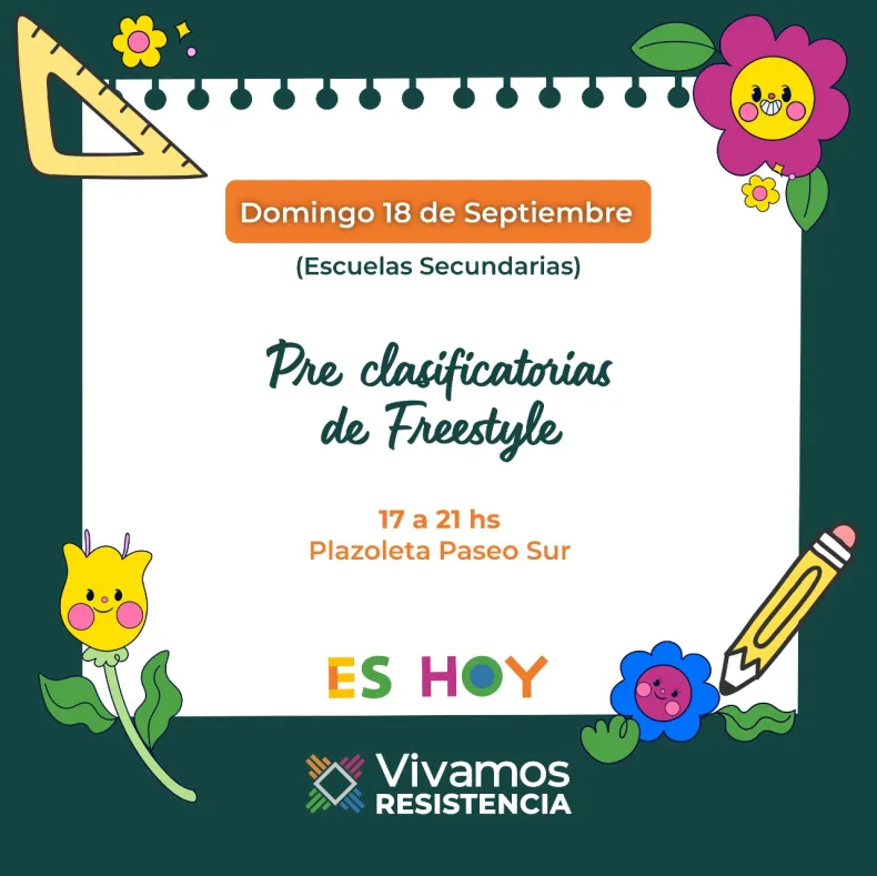 En el marco de las actividades estudiantiles del programa Es Hoy, la Municipalidad de Resistencia llevará a cabo este domingo 18 de septiembre la instancia Pre-Clasificatoria de la Olimpiada Freestyle, donde alumnos y alumnas de distintas escuelas secundarias mostrarán sus destrezas en la plaza Paseo Sur (avenida Belgrano y Falucho).