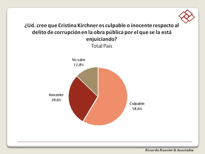 Mientras que un 28,6% de los encuestados creen que la ex mandataria es inocente, un 58,6% considera que Cristina Kirchner es culpable de corrupción por los hechos investigados en la causa y por los que los fiscales pidieron una condena de 12 años de prisión, además de la inhibición perpetua para ocupar cargos políticos. Un 12,8% de los entrevistados, manifestó no saber qué responder.
