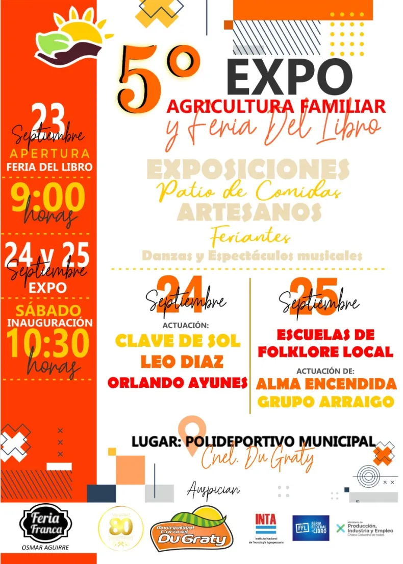 El sábado 24 en el predio del polideportivo municipal se comenzará con el acto de apertura de la Expo a las 10:30 hs y donde se realizará el corte de cinta inaugurando la "5ta Expo" para luego dar lugar a una recorrida por parte de las autoridades y de la comunidad en general. Ya en horas de la noche, a las 21hs, se dará comienzo a la Noche Popular donde actuaran los grupos musicales: