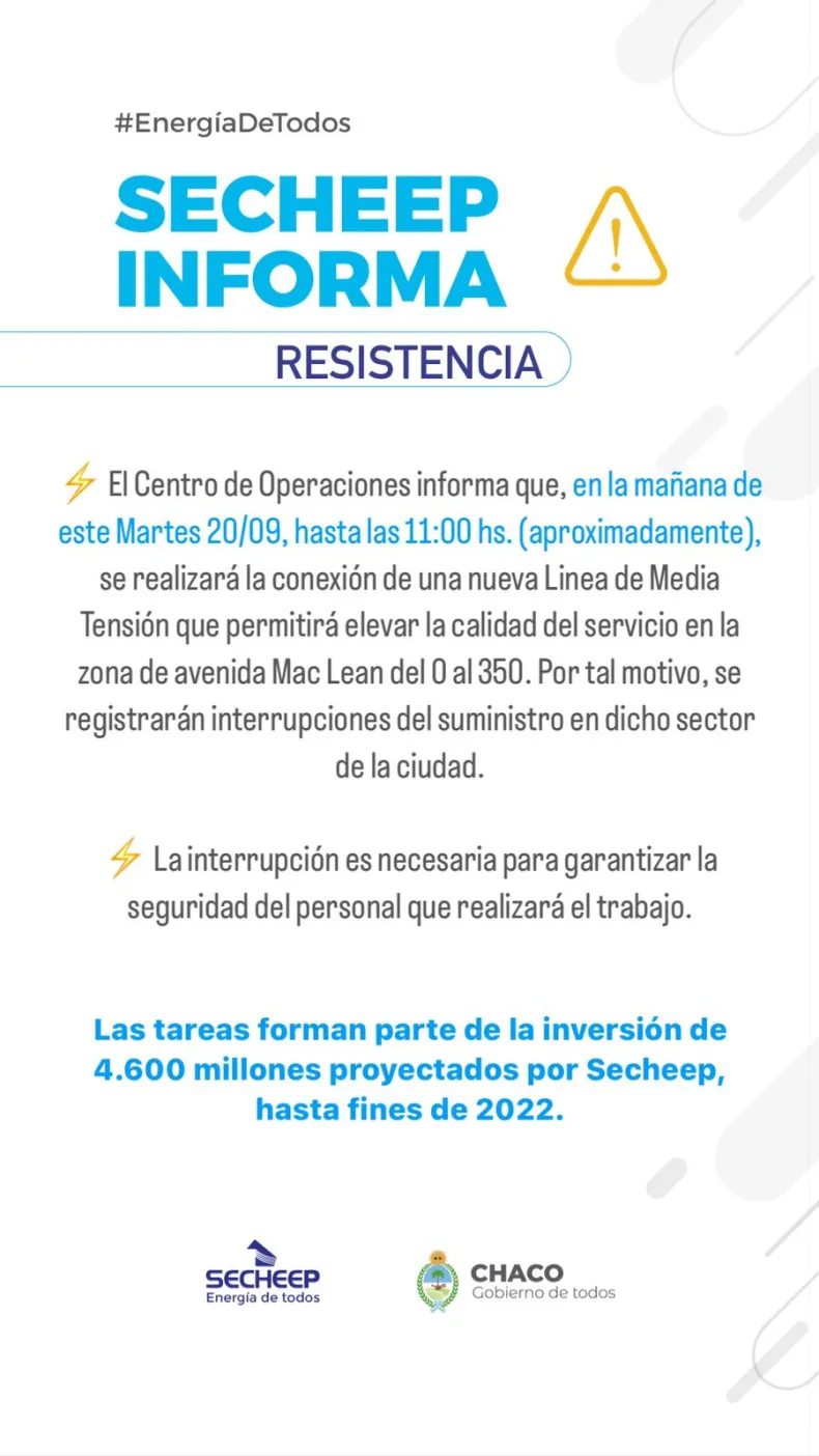Desde su cuenta oficial de Twitter, la empresa de Secheep emitió un comunicado para vecinos de Resistencia: "Atención Resistencia".