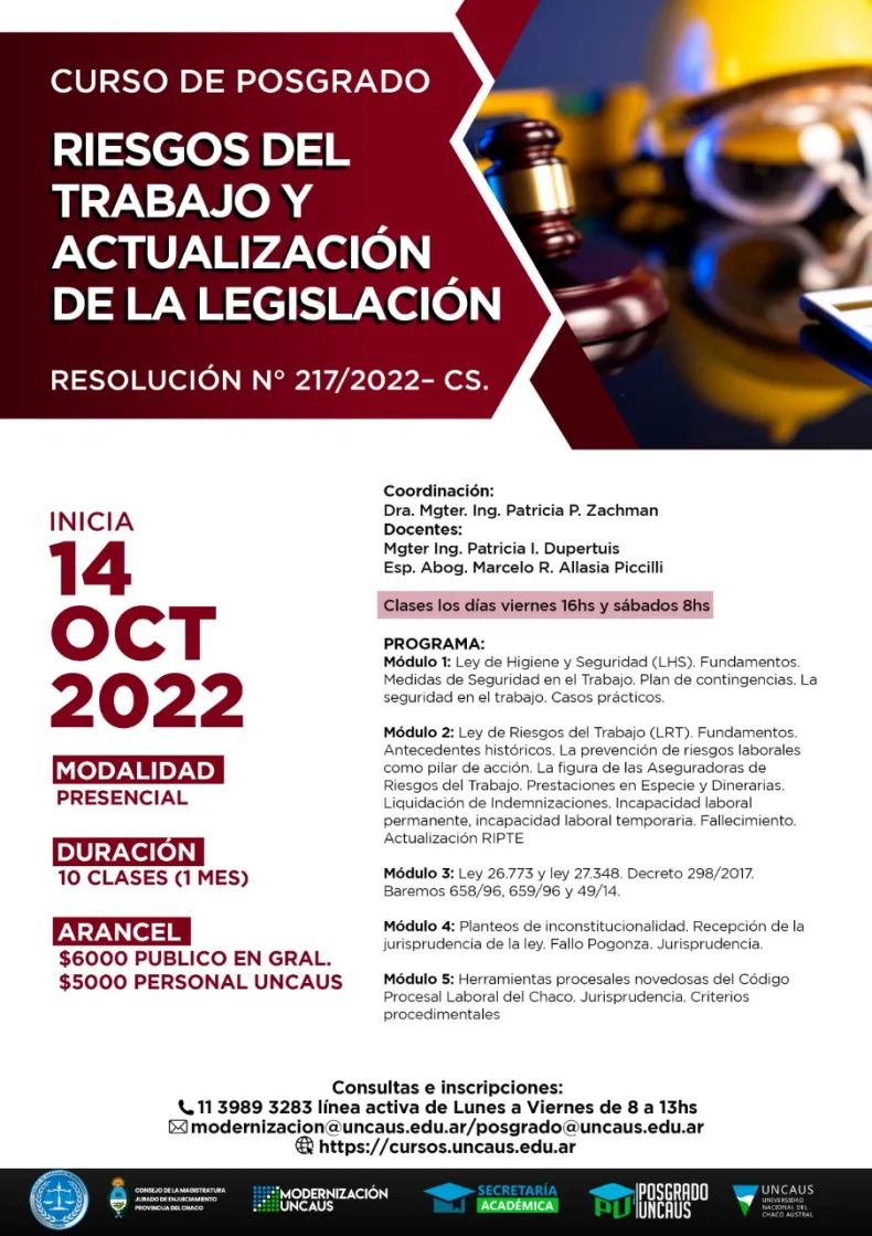 Están abiertas las inscripciones para el Curso de Posgrado en Riesgos del Trabajo y Actualización de la Legislación, que se realizará de forma presencial en la Universidad Nacional del Chaco Austral (UNCAUS), y que iniciará el 14 de octubre de 2022 y tendrá una duración de un mes de cursado. Se entregarán certificados de asistencia y aprobación al curso, una vez culminado.