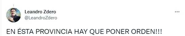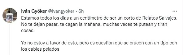 Por otro lado, el representante de Republicanos Unidos en Chaco, Iván Gyöker escribió que "estamos todos los días a un centímetro de ser un corto de Relatos Salvajes. No te dejan pasar, te cagan la mañana, muchas veces te putean y tiran cosas". Asimismo, aclaró que no está a favor de actuar con violencia, "pero es cuestión que se crucen con un tipo con los cables pelados".