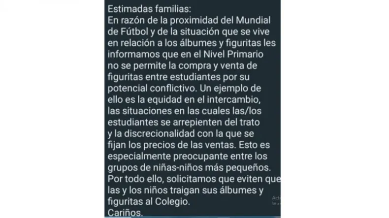 "Debido a la proximidad del Mundial de Fútbol y de la situación que se vive en relaciona los álbumes y figuritas les informarnos que en el Nivel Primario no se permite la compra y venta de figuritas entre estudiantes por su potencial conflictivo", comenzó el comunicado.