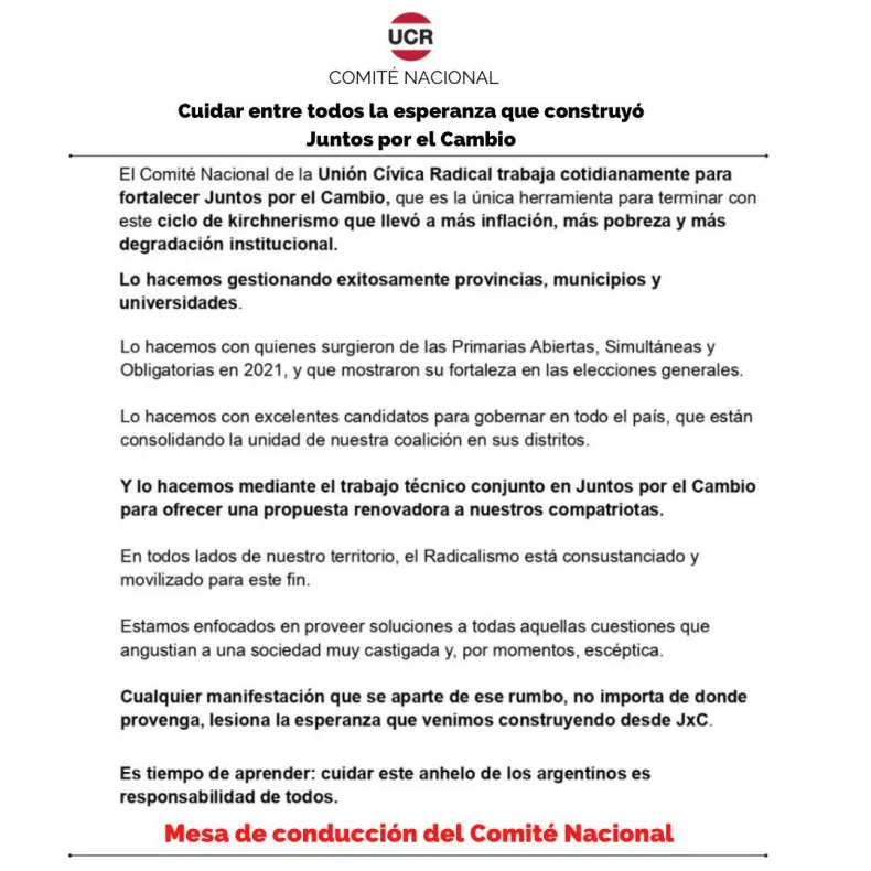 En este contexto, el Comité Nacional de UCR se diferenció de los dichos de Manes y sentenció que cualquier manifestación que se aleje de ese fin, sin importar de donde provenga, "lesiona la esperanza que venimos construyendo desde JxC".