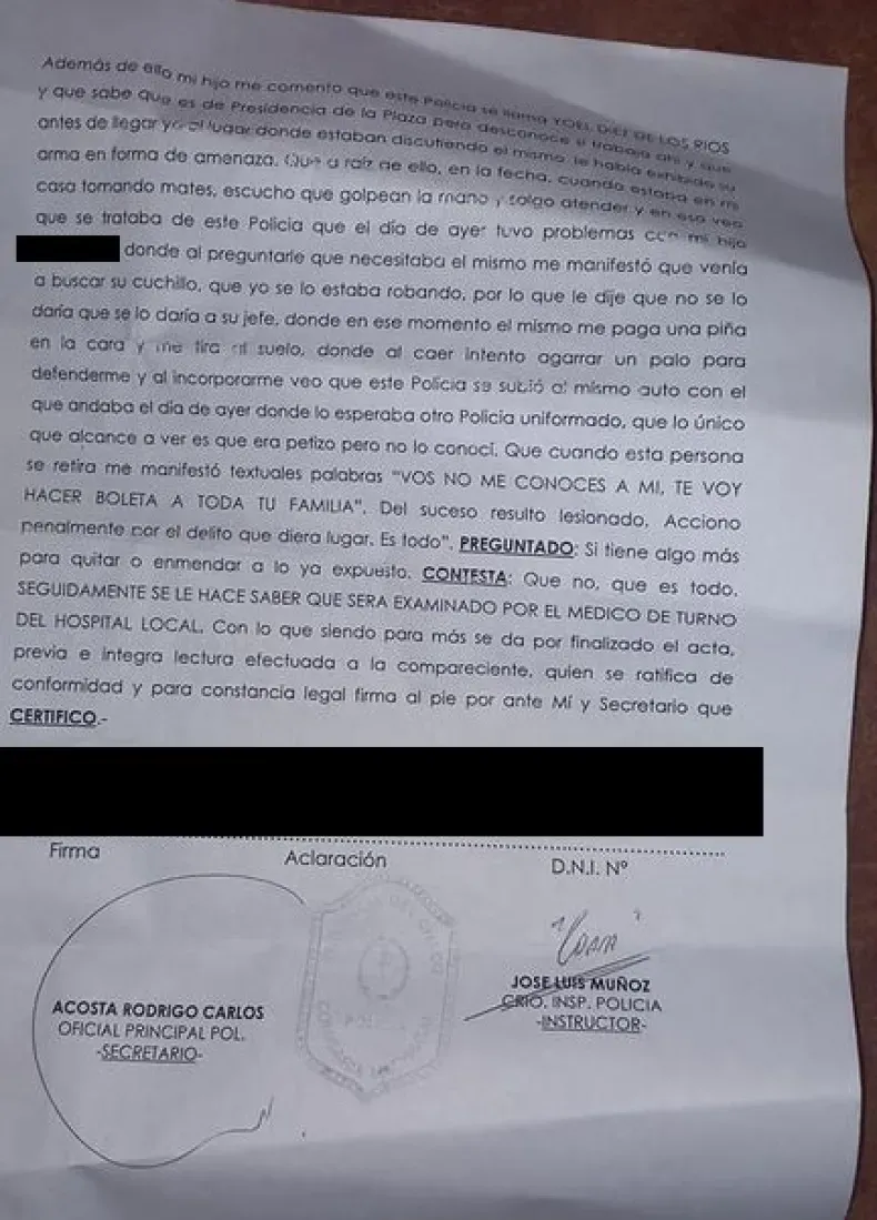 Tras el altercado, el policía fue hasta la casa del hombre a buscar su cuchillo, pero éste se negó porque su intención era mostrarle a su jefe. Ante la negativa, le pegó "una piña en la cara" y lo tiró al suelo.