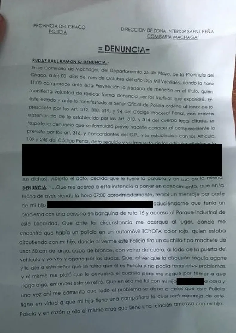 Al regresar a la casa junto a su hijo, el mismo le reveló que el efectivo le "exhibió su arma en forma de amenaza" y que el problema se debe a "celos por una compañera que sería la expareja de este policía oriundo de Presidencia de la Plaza que cree que tiene una relación amorosa" con él.