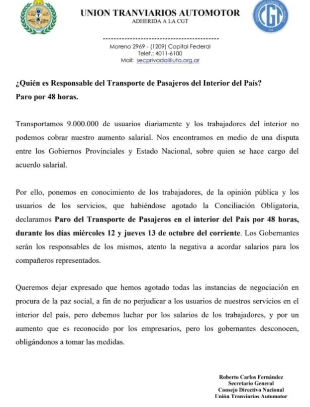 De esta manera, afirmaron que "hemos agotado todas las instancias de negociación en procura de la paz social, a fin de no perjudicar a los usuarios de nuestros servicios en el interior del país, pero debemos luchar por los salarios de los trabajadores, y por un aumento que es reconocido por los empresarios".