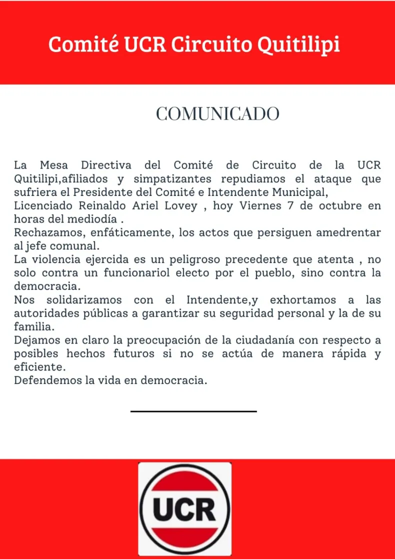 Tras la amenaza de muerte que recibió el intendente de Quitilipi, Reinaldo Ariel Lovey, en la mañana de este viernes, desde el Comité UCR Quitilipi emitieron un comunicado en el que repudian al ataque: "Rechazamos, enfáticamente, los actos que persiguen amedrentar al jefe comunal", afirmaron.