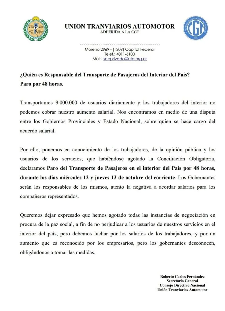 De esta manera, afirmaron que "hemos agotado todas las instancias de negociación en procura de la paz social, a fin de no perjudicar a los usuarios de nuestros servicios en el interior del país, pero debemos luchar por los salarios de los trabajadores, y por un aumento que es reconocido por los empresarios".