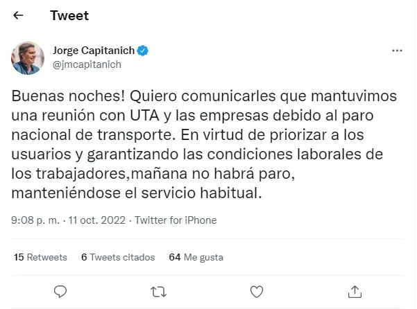 El gobernador Jorge Capitanich fue el encargado de anunciar en sus redes sociales que tras una reunión con la UTA y las empresas la medida de fuerza se levantó.