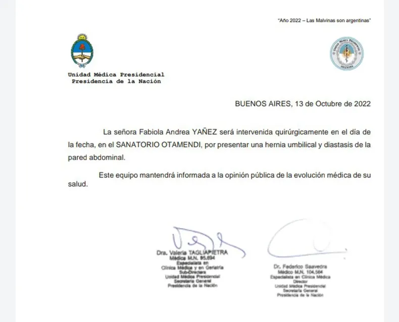 "La señora Fabiola Yañez será intervenida en el día de la fecha, en el Sanatorio Otamendi, por presentar una hernia umbilical y diastasis de la pared abdominal", indicó el escrito.