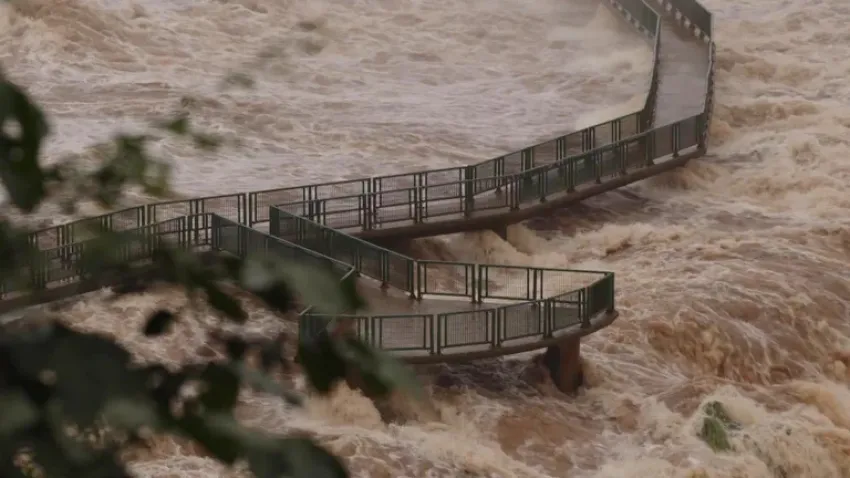 Desde hace algunos días, la zona de las Cataratas se encuentra afectada por la creciente de los ríos Iguazú y Uruguay, principalmente del lado brasileño. En las últimas horas, el caudal provocó el desprendimiento de una parte de la pasarela de la Garganta del Diablo.