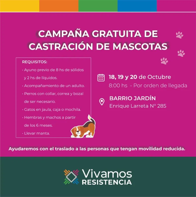 El Municipio de acerca el programa "Mi Mascota" este martes 18, miércoles 19 y jueves 20 de octubre en el predio de calle Larreta 285 del barrio Jardín, de 8 a 12 horas. Esta iniciativa consiste en la castración gratuita de perros y gatos y se atienden 100 mascotas por día con turnos por orden de llegada.