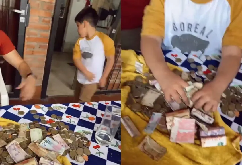 Su tía fue la encargad de grabar el momento. En el mismo se puede ver la plata desparramada arriba de una mesa y el enojo del pequeño al descubrir que con sus ahorros solo le alcanzaba para comprarse 12 paquetes de figuritas del Mundial.