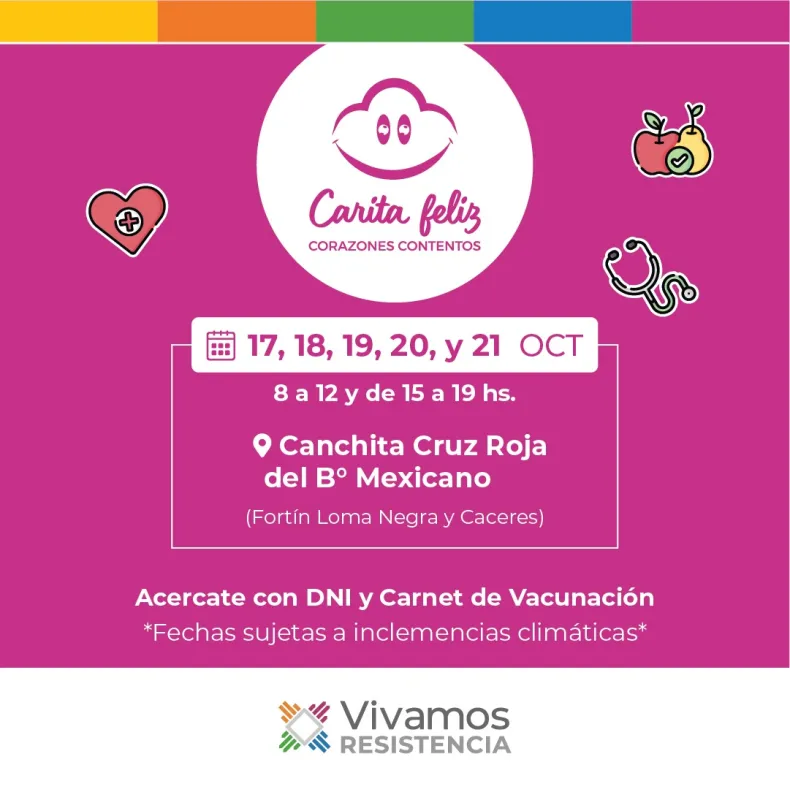 Del miércoles 19 al viernes 21, el programa impulsado por el gobierno de Resistencia "Carita Feliz", continuará en la cancha "Cruz Roja" del barrio Mexicano, ubicada en calles Fortín Loma Negra y Cáceres, de 8 a 12 y de 15 a 19 horas, destinada a niños hasta los 12 años. Los asistentes deberán llevar sus documentos de identidad y carnet de vacunas.