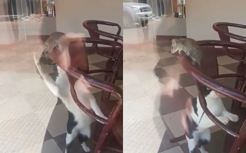 En la imagen se ve al gato intentando atrapar a la rata y una vez que quedan frente a frente no tiene ninguna reacción.