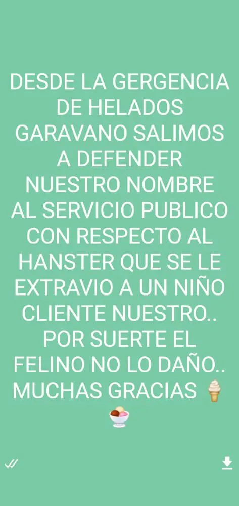 En este sentido, junto al video se difundió un comunicado que sería de la Heladería Garavano, el cual dice: "Desde la gerencia de Helados Garavano salimos a defender nuestro nombre, con respecto al hámster que se le extravió a un niño cliente nuestro. Por suerte el felino no lo dañó".