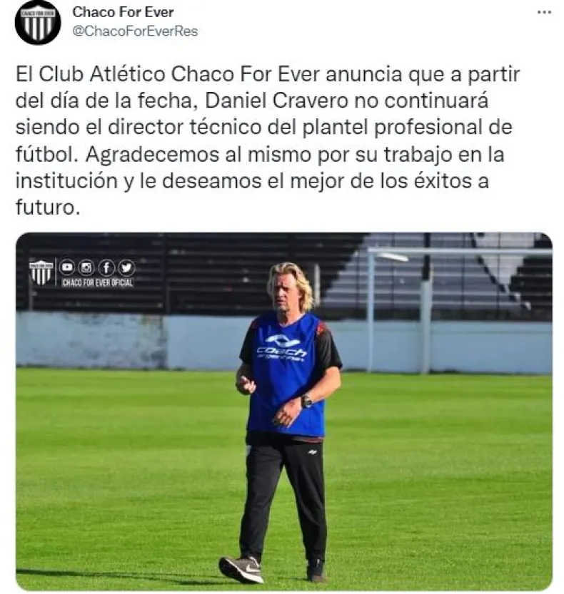 La información la dio a conocer el propio club mediante un posteo que realizó en su cuenta de Twitter. Allí mencionaron: "El Club Atlético Chaco For Ever anuncia que, a partir del día de la fecha, Daniel Cravero no continuará siendo el director técnico del plantel profesional de fútbol. Agradecemos al mismo por su trabajo en la institución y le deseamos el mejor de los éxitos a futuro".